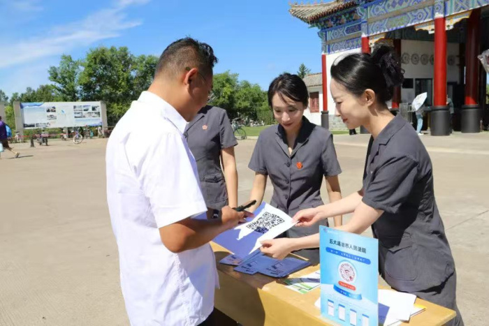 同时,在北饮泉、火山地质博物馆等热门景点,法院还专门设置了“涉旅纠纷咨询台”,提供法律咨询、“两状”指导等服务,并通过发放宣传册、现场演示“龙法和”云法庭小程序使用方法,引导游客“扫码解纷”,实现“指尖上的司法服务”。小小的咨询台虽不起眼,却像一个个“法治窗口”,随时为有需要的人答疑解惑。一位刚咨询完的游客点赞道:“出来玩就怕遇到麻烦事,现在景区里有法院的人帮忙,心里踏实多了!”