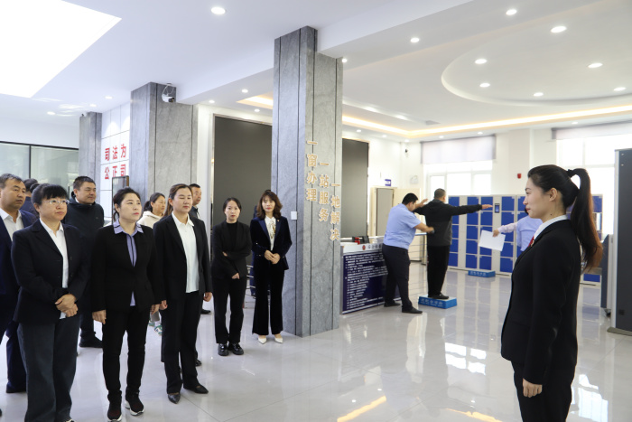 在讲解员的引导下,医护人员依次参观了诉讼服务中心、羁押室、执行指挥中心及第一法庭。诉讼服务大厅内,讲解员详细介绍了服务设施功能、立案流程,让医护人员对法院机构设置、信息化应用及文化建设有了全面了解。审判法庭内,智能化建设令人耳目一新,同步录音录像、语音识别、证据展示平台等功能一应俱全,将公开、透明、科技完美融合。