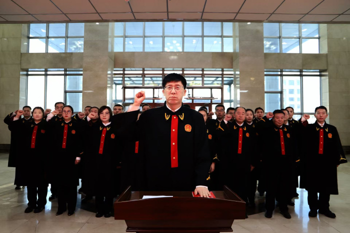 宣誓仪式现场,国旗鲜艳,气氛庄重肃穆。全体宣誓人员身着法袍,整齐肃立。在于祥院长的带领下,宣誓人员右手举拳,面向国旗,庄严诵读誓词:“我宣誓:忠于中华人民共和国宪法,维护宪法权威,履行法定职责,忠于祖国、忠于人民,恪尽职守、廉洁奉公,接受人民监督,为建设富强、民主、文明、和谐、美丽的社会主义现代化强国努力奋斗!”